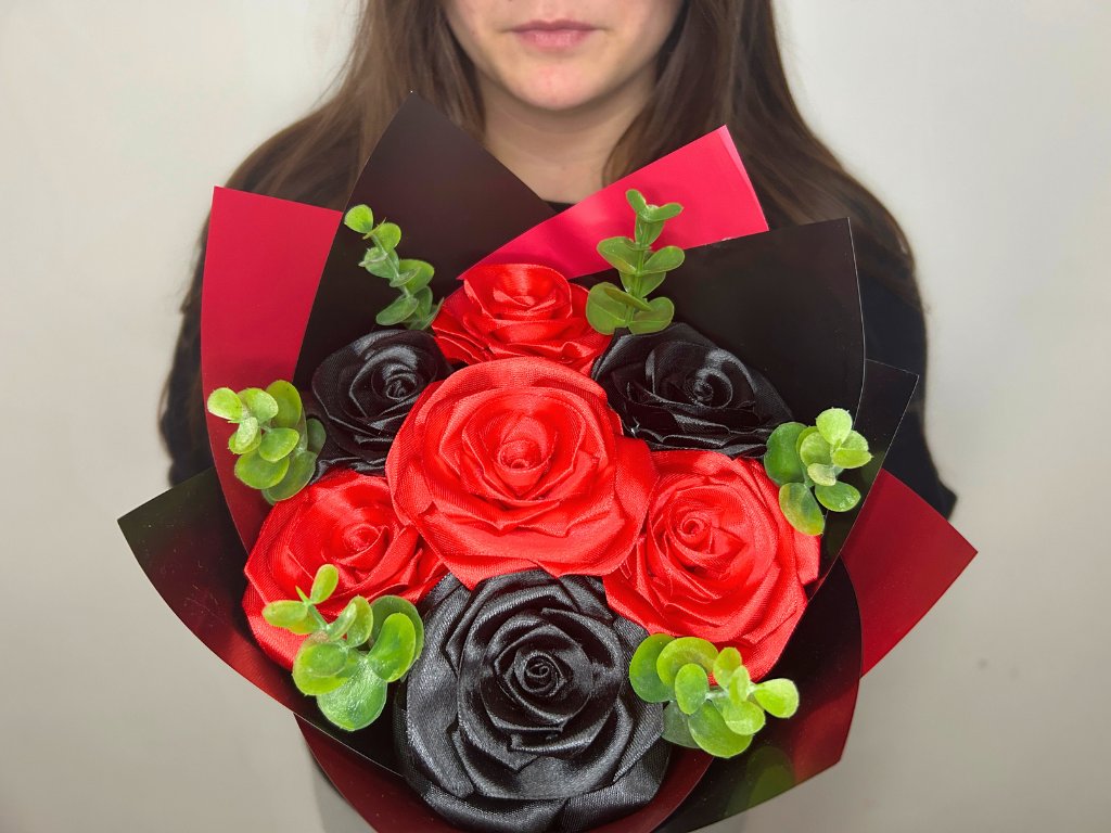 Výrazná kytice ze 7 saténových růží v kombinaci červené a černé barvy doplněná dekorativními lístky. Elegantní a odvážná kytice, která zaujme na první pohled. Hodí se pro silné vyznání, slavnostní příležitost nebo jako originální dárek.